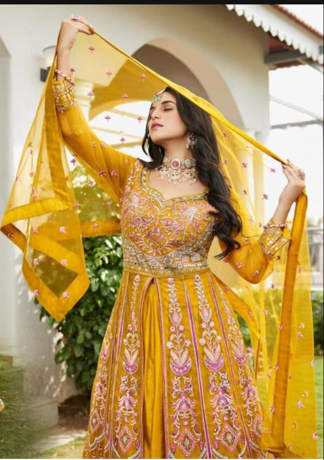 Embrace elegance with this timeless Indo-Western gown, a perfect harmony of luxurious detailing and sophisticated silhouette. Richly embroidered with a mix of traditional and modern motifs, this outfit is designed to elevate your festive wardrobe. Its flowy structure and statement dupatta make it a standout pick for celebrations big and small.