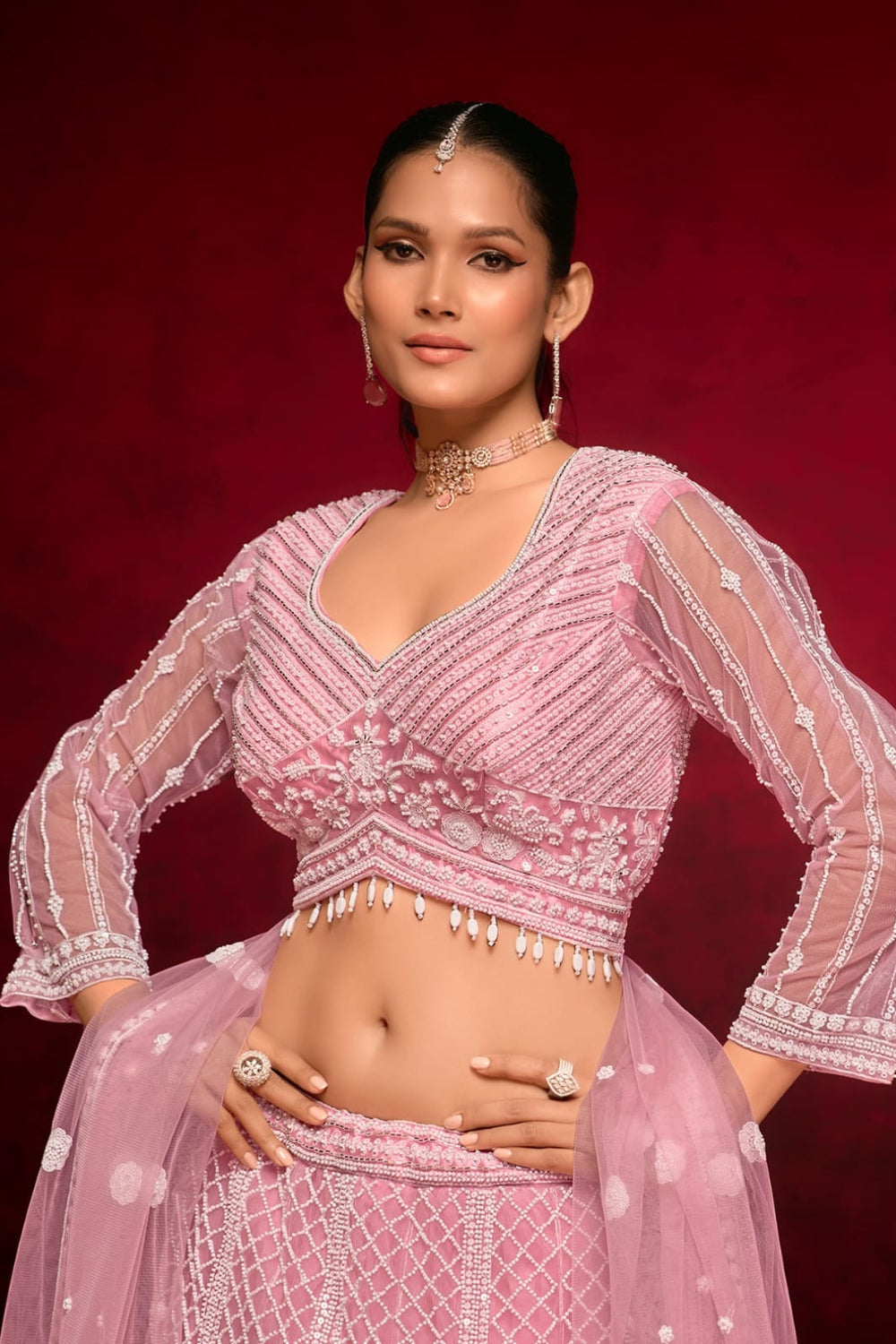 Blush Pink Embroidered Lehenga Choli with Sheer Dupatta by B Girl