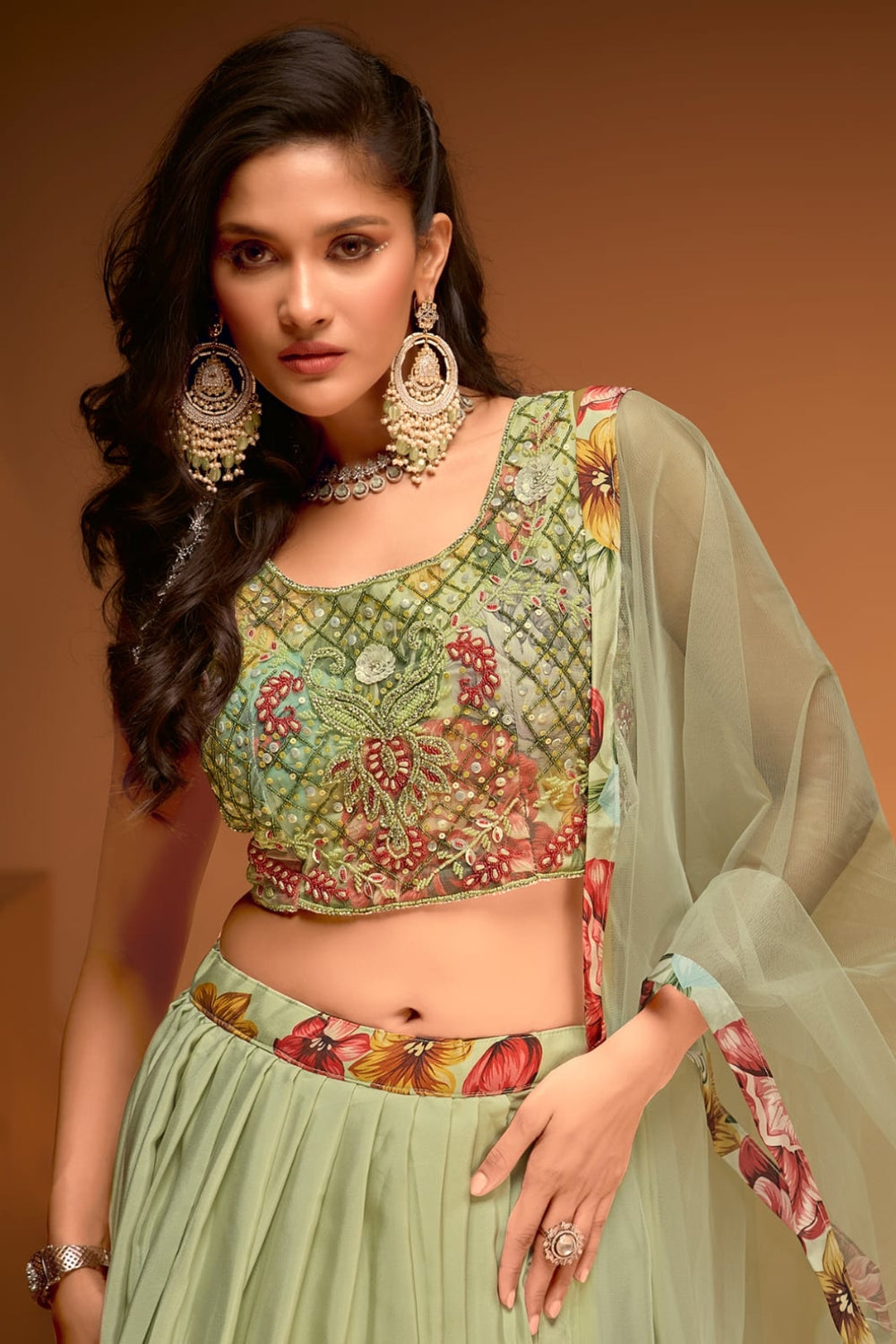 Embrace timeless beauty with this exquisite pastel green lehenga set from B Girl. The intricately embroidered choli features delicate floral detailing with vibrant threadwork, beads, and sequins, adding a regal charm. The flowy lehenga showcases a mesmerizing bloom of colorful flowers along the hemline, creating a captivating look. Paired with a soft net dupatta for a graceful finish, this outfit is perfect for weddings, festive gatherings, or special occasions. Make a statement with this elegant fusion of tradition and style.