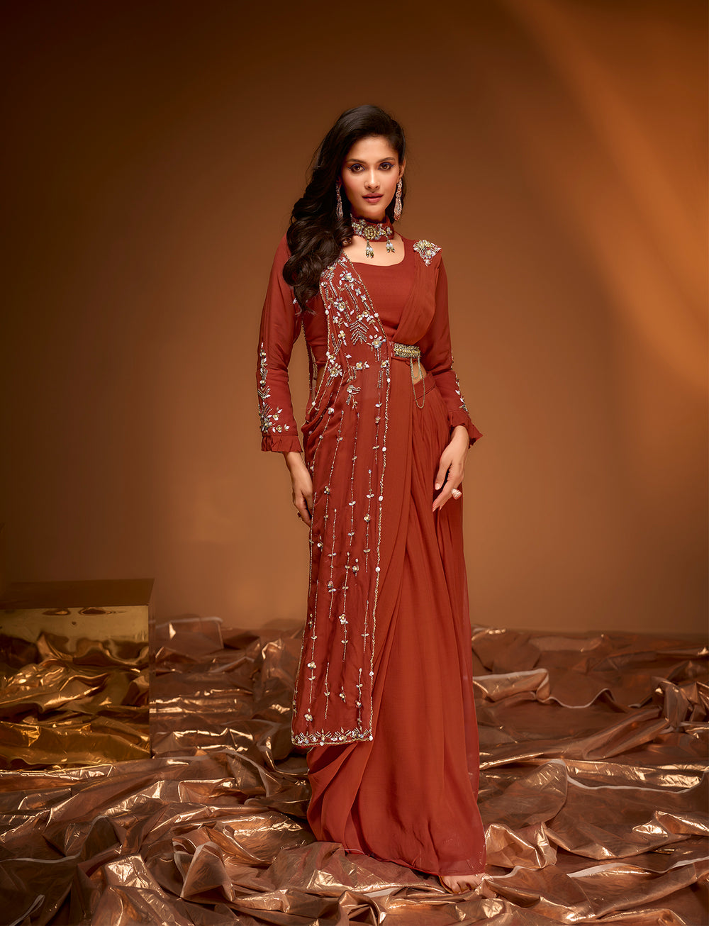 Embrace elegance with Bee Girl's Regal Rust Embroidered Gown. Featuring intricate embroidery and a graceful attached cape, this rust-colored ensemble is perfect for weddings and festive occasions. Pair it with statement jewelry for a regal look.