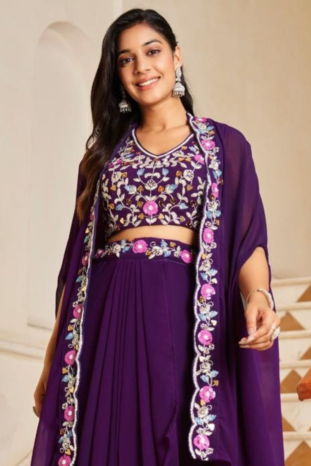 Drape yourself in royalty with this stunning Choli with Jacket set from Bee Girl. The deep purple hue, intricate floral embroidery, and flowing silhouette make it a timeless statement piece. The beautifully adorned jacket adds a layer of grace, while the matching embroidered choli and waistband enhance the overall charm. Perfect for weddings, festive gatherings, and grand celebrations, this ensemble exudes elegance and sophistication. Pair it with statement earrings and a delicate ring to complete the regal look.