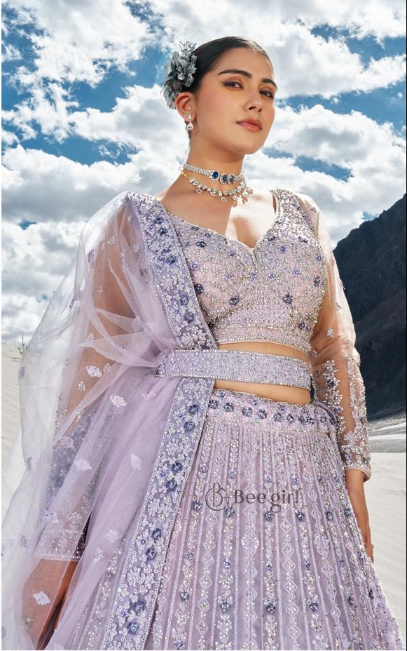 Step into royalty with this exquisitely designed lehenga set, where tradition meets delicate modern craftsmanship. The pastel-toned skirt is richly adorned with floral threadwork, shimmering sequins, and intricate motifs that echo vintage charm. Paired with a full-sleeved sheer blouse and a matching dupatta, this look is designed for the spotlight.