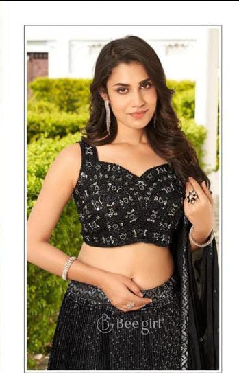 Step into the spotlight with the Moonlit Grace lehenga – a stunning black ensemble that sparkles like a starry night. This elegant outfit is crafted from premium net fabric layered over soft satin, intricately embellished with shimmering sequins and delicate thread embroidery.