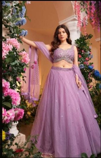 Lavender just got a power upgrade! This lehenga is made for the trendsetter who knows how to turn heads. The cropped blouse with bead fringe screams runway-ready, while the airy, twirl-friendly skirt brings volume and flair. Paired with a sheer dupatta — this is fashion goals, period.