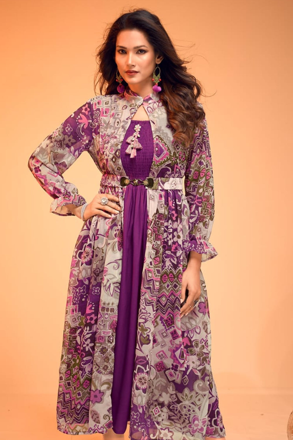 Step into elegance with this captivating violet-hued gown by B Girl. Designed with intricate mosaic-inspired prints, this gown features a pleated bodice with delicate tassel embellishments and a keyhole neckline for added charm. The belted waist with ornate detailing flatters your figure, while the sheer overlay with lively patterns gives a graceful flow. Ideal for festive occasions, cultural gatherings, or evening parties, this gown combines comfort with statement style.