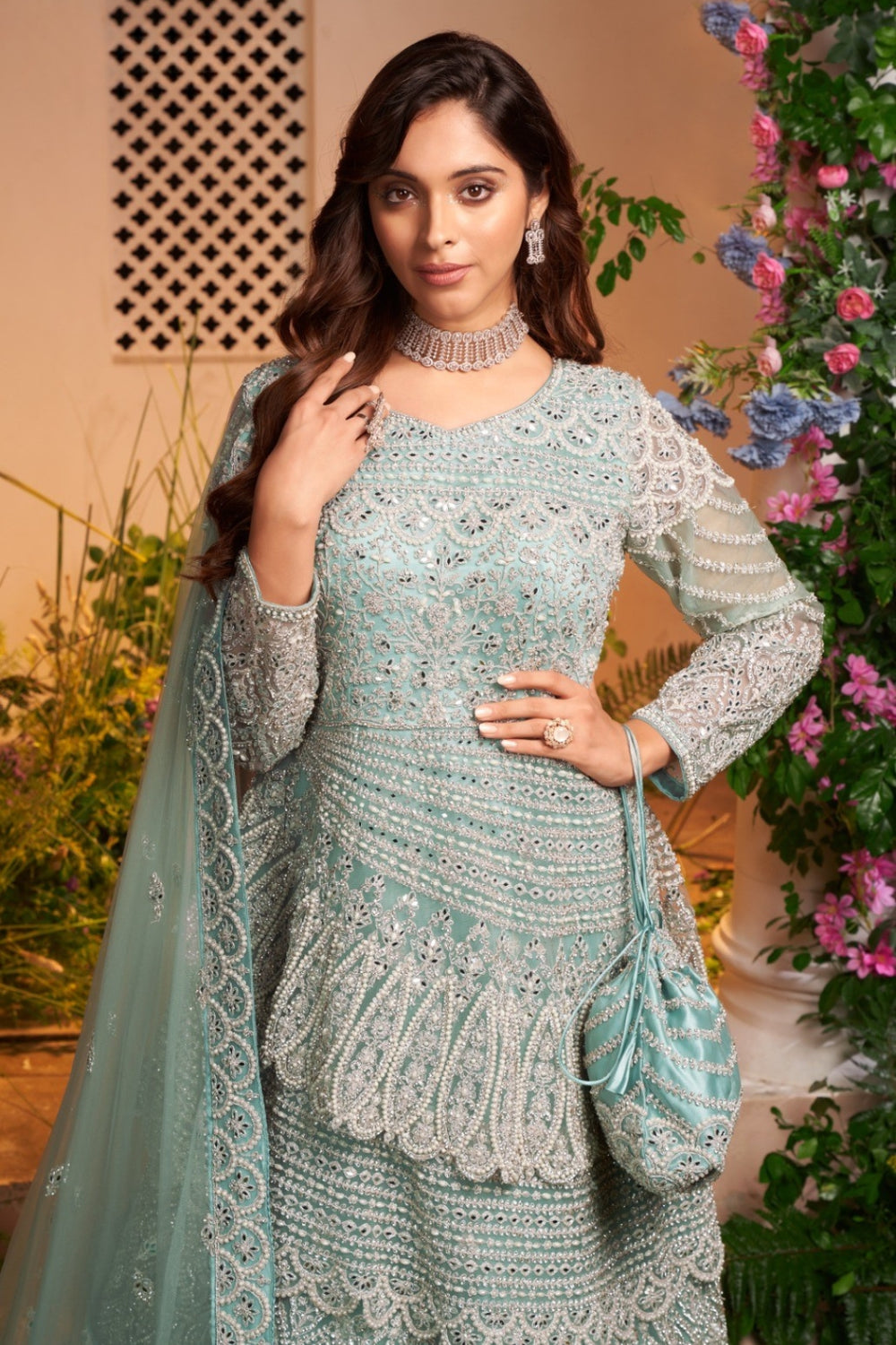 Presenting our stunning Serene Aqua Embroidered Gown from B Girl, designed to elevate your style with elegance. This exquisite gown features intricate silver embroidery enriched with shimmering sequins and beadwork, creating a mesmerizing pattern throughout. The delicate net sleeves adorned with detailed embellishments add a touch of charm. Paired with a matching dupatta and a stylish potli bag, this gown is perfect for weddings, receptions, or festive occasions. Step into timeless grace with this beautifully crafted ensemble.