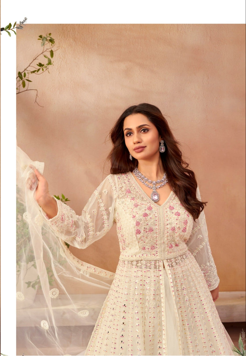 Celebrate timeless beauty in this ivory Anarkali, adorned with exquisite pink floral embroidery and mirror work. The floor-length flare, combined with a soft dupatta and classic neckline, offers a regal yet delicate appeal – a true tribute to heritage with a hint of modern grace.
