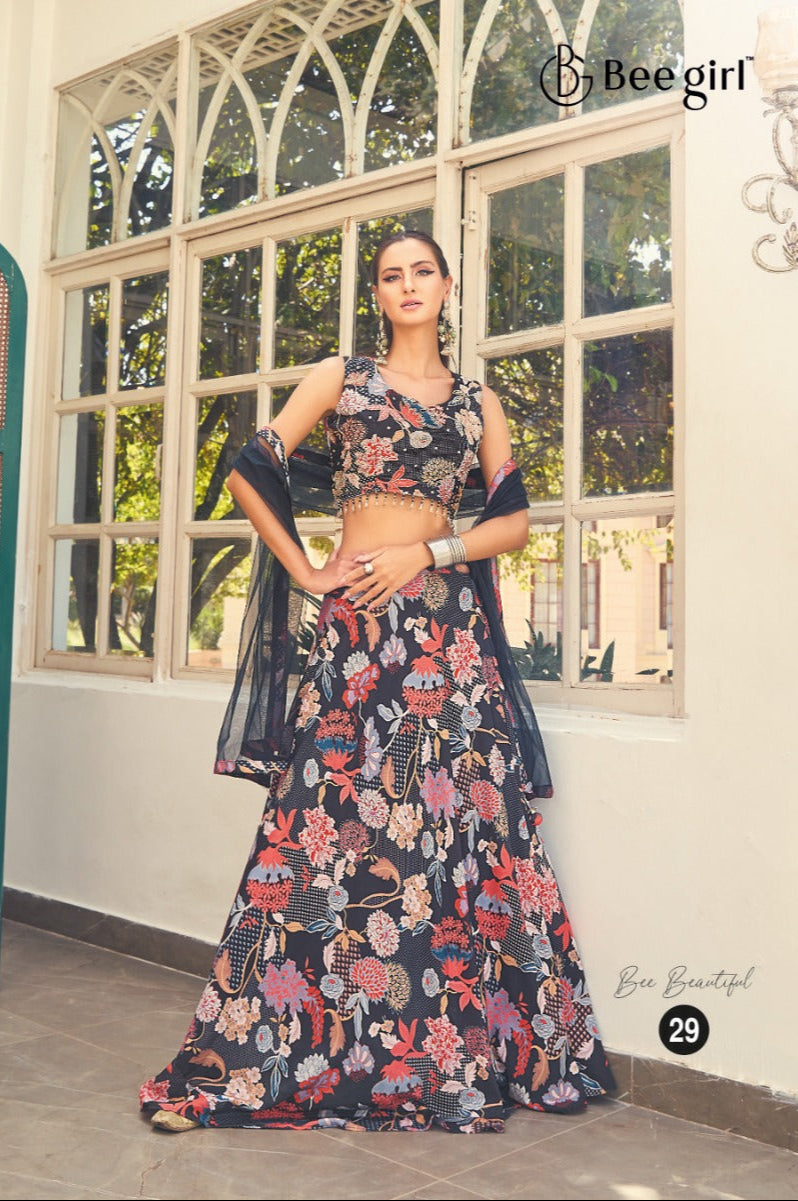 Turn heads with this stylish black lehenga set featuring vibrant floral embroidery and a contemporary cold-shoulder blouse. The flowy silhouette and net dupatta add a playful yet graceful vibe — ideal for weddings, festive occasions, or a glamorous night out.