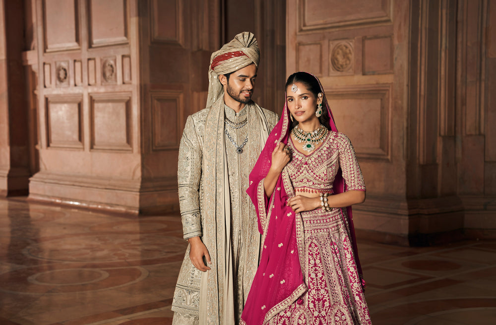 Embrace regal elegance with this exquisite bridal lehenga set, featuring intricate embroidery and luxurious craftsmanship. The heavily embellished lehenga, paired with a detailed blouse and a gracefully draped dupatta, makes it the perfect choice for weddings and grand celebrations.