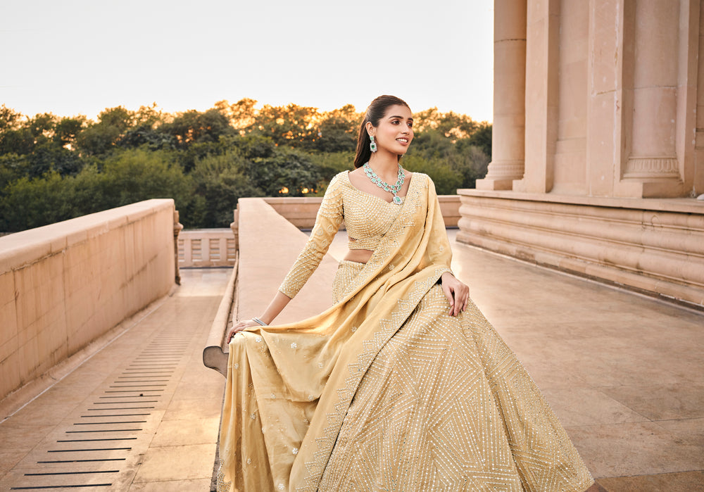 This regal golden beige lehenga set features an off-shoulder blouse with intricate sequin and bead embroidery, paired with a voluminous flared skirt. Crafted from luxurious net fabric with a shimmer finish, it is complemented by a delicately embroidered dupatta