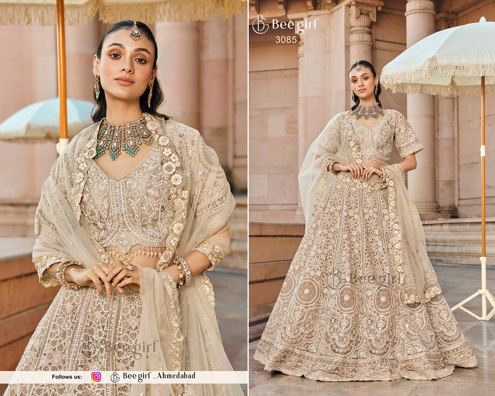 This exquisite beige bridal lehenga is a true masterpiece of traditional Indian craftsmanship. It features intricate all-over embroidery with delicate threadwork, sequins, and mirror detailing, creating a regal and timeless look. The lehenga is paired with a matching heavily embellished blouse and a sheer net dupatta adorned with floral applique work.