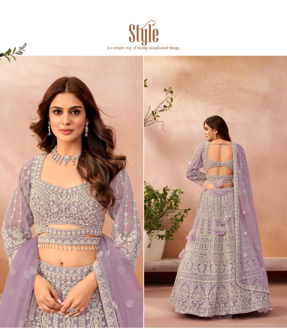 Drape yourself in timeless luxury with this lavender lehenga set adorned in delicate thread and sequin work. Crafted on premium net with intricate detailing, the circular flare adds grandeur, while the matching blouse and net dupatta complete the regal look. Ideal for wedding events, festive celebrations, and traditional gatherings.