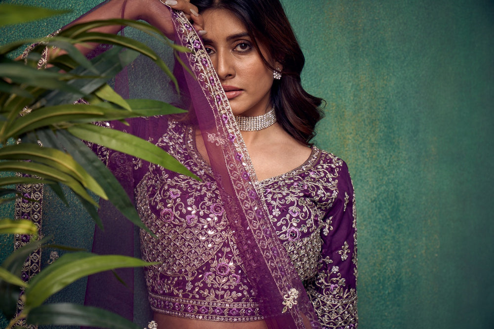 Step into grace with this heavily embroidered royal purple lehenga, paired with a beautifully designed blouse and a sheer net dupatta. A must-have for weddings and festive occasions!