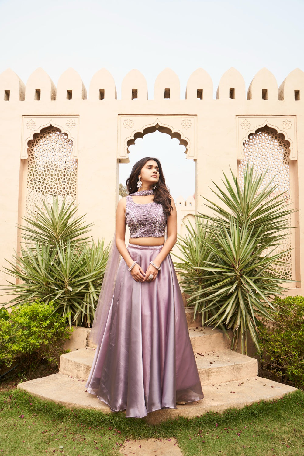 Step into timeless charm with this stunning lavender lehenga set. The blouse is intricately hand-embroidered with mirrors and sequins, adding just the right sparkle. Paired with a gracefully flared lehenga crafted from a matte-finish fabric, this look strikes the perfect balance between elegance and comfort. The matching dupatta with subtle edging completes the outfit effortlessly.