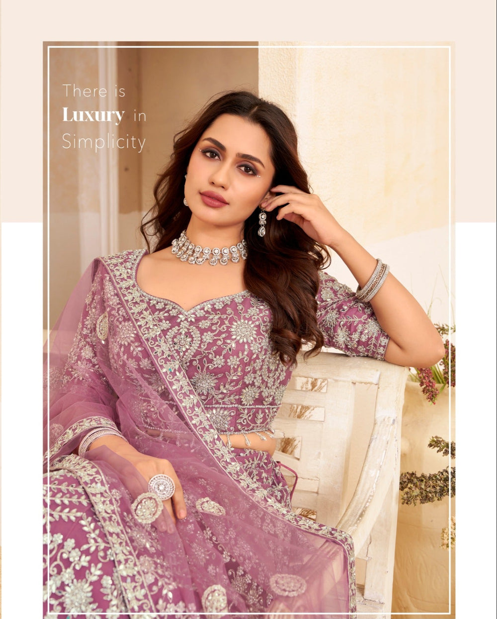 Inspired by royal charm, Royal Bloom brings a soft romantic vibe to any celebration. The full flare lehenga is lavishly decorated with intricate motifs, while the blouse features a delicate neckline that enhances femininity. Finished with a net dupatta that adds lightness and movement.