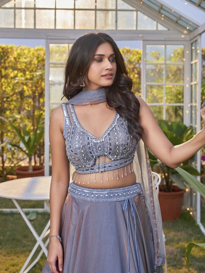 Embrace elegance with this stunning sky blue Lehenga Choli from B Girl. The soothing hue paired with delicate embellishments creates a mesmerizing look, perfect for weddings, festive gatherings, or special events. This graceful outfit combines traditional charm with modern finesse, making it a must-have for your ethnic wardrobe.