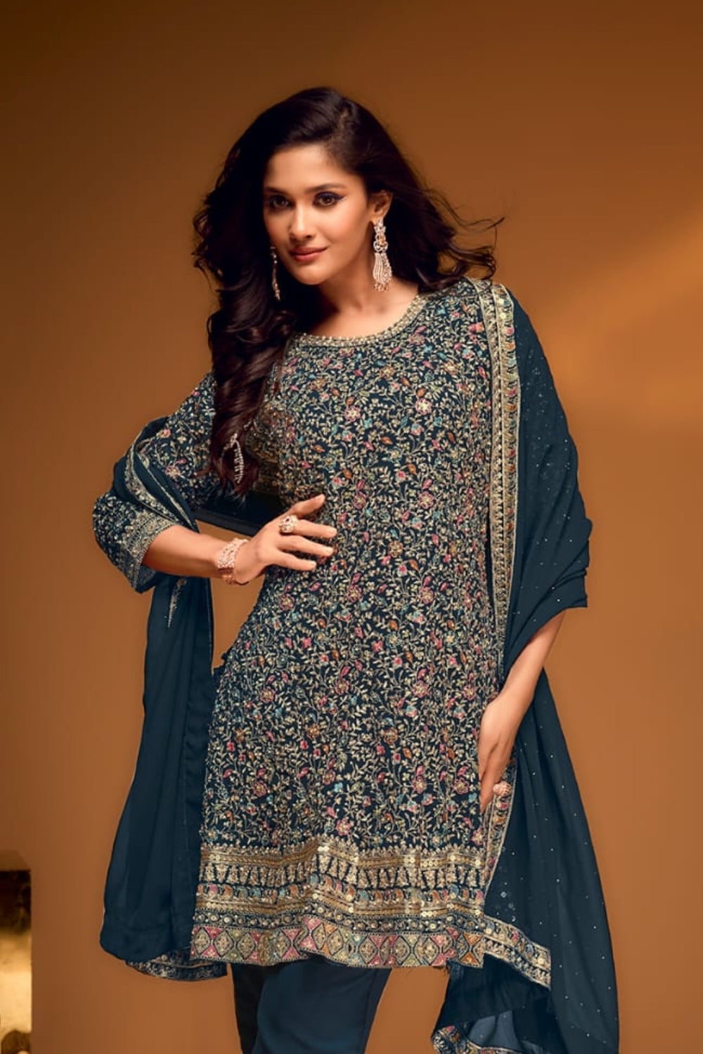 Embrace timeless beauty with this navy blue Anarkali set by B Girl. Intricately adorned with delicate floral embroidery, this ensemble boasts a rich blend of vibrant hues on a deep navy base. The finely crafted borders with gold and pastel detailing add a regal touch, making it perfect for weddings, festive occasions, or special celebrations. Paired with a matching dupatta featuring elegant embellishments, this Anarkali radiates grace and sophistication. Style it with statement jewelry for an effortlessly glamorous look.