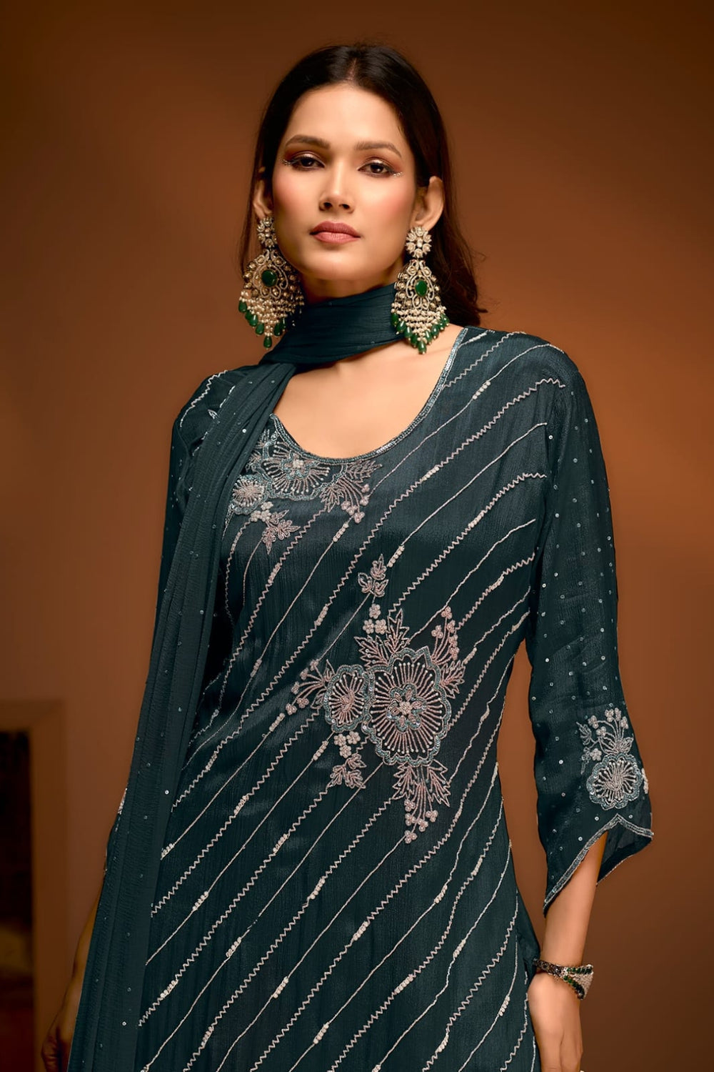 Drape yourself in timeless elegance with this royal blue sharara set by B Girl. Adorned with delicate silver embroidery in floral motifs and diagonal patterns, this ensemble exudes grace and charm. The finely detailed kurta pairs beautifully with the flowy sharara pants, creating a stunning silhouette. Complemented by a matching dupatta, this outfit is ideal for festive gatherings, weddings, and grand celebrations. Pair it with statement earrings for a truly regal look.