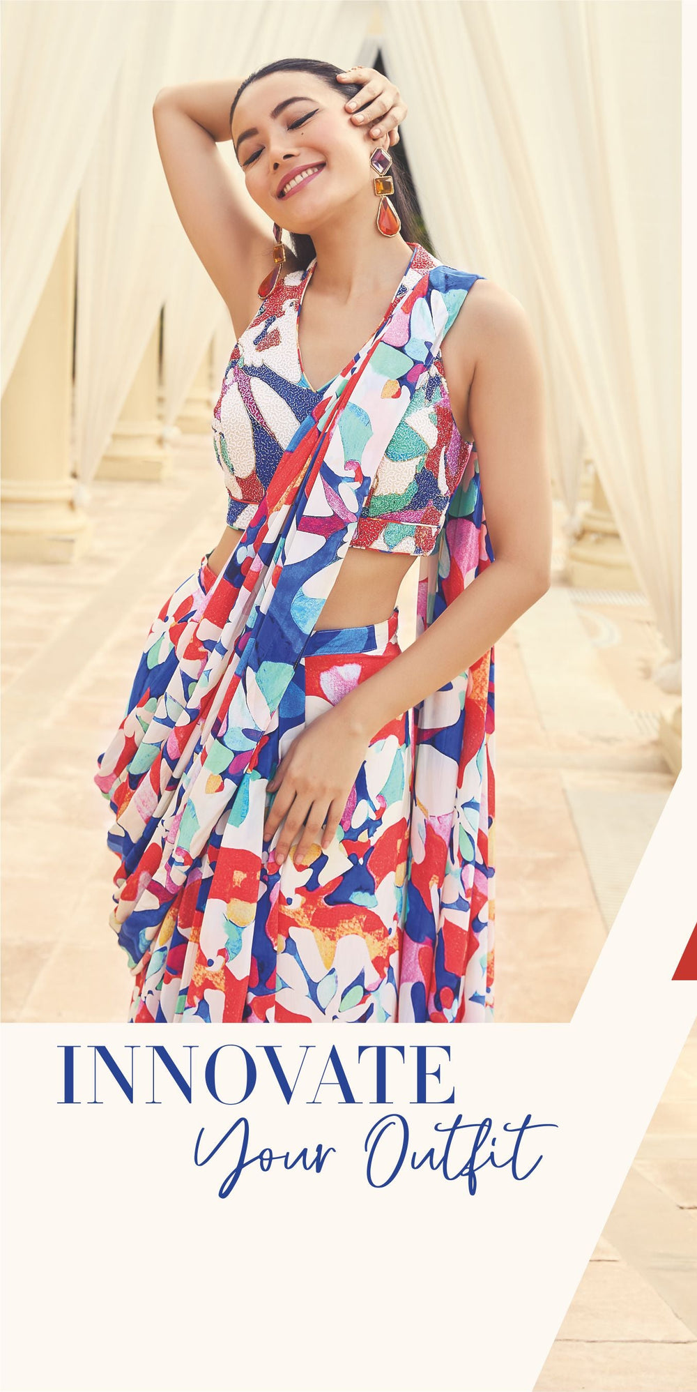 A blend of modern aesthetics and traditional elegance, this saree features a stunning abstract print in bold hues. The lightweight georgette fabric offers a fluid drape, while the sequined blouse adds a touch of glamour. Perfect for festive occasions, resort wear, or contemporary celebrations.